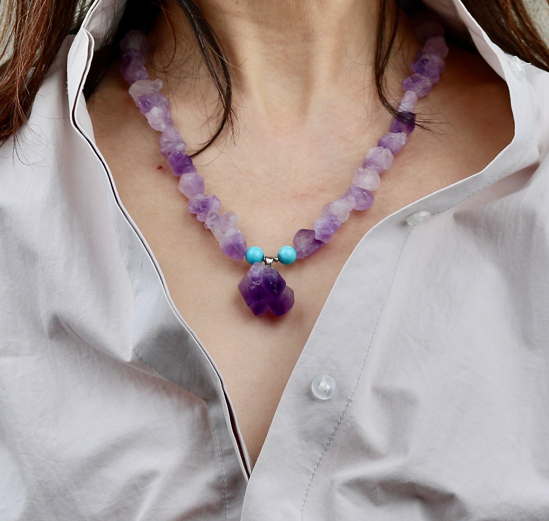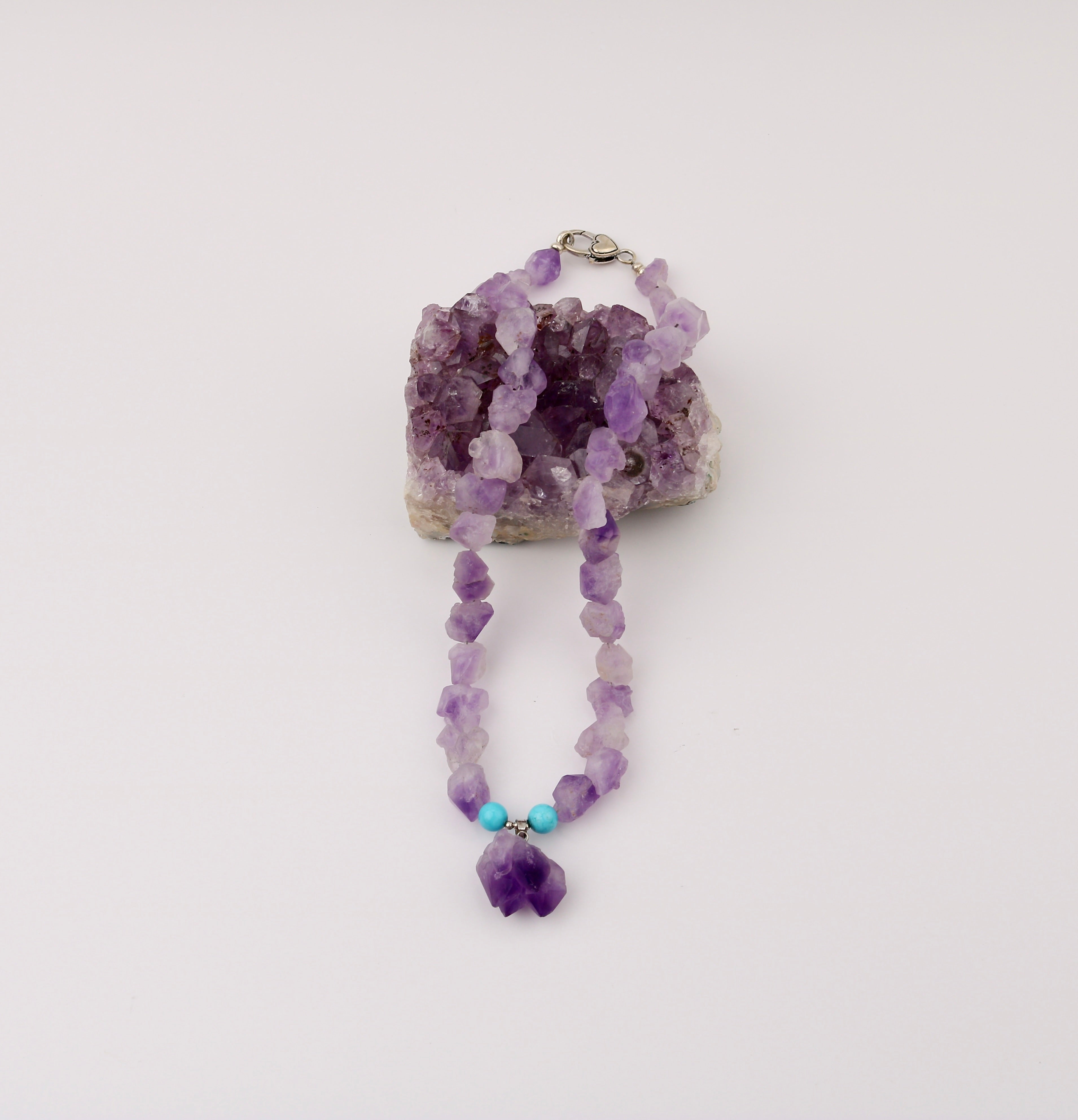 Raw and radiant, this necklace celebrates the quiet poetry of nature. Faceted by the earth rather than by symmetry, each Brazilian amethyst stone carries its own whisper of violet—soft lilac melting into deeper royal purple. The organic rhythm of the amethyst rocks rests gently along the neckline, while a single, deeper-toned amethyst at the center anchors the piece like a talisman. Finished with a silver heart clasp, it feels intimate and soulful—an ode to natural beauty, intuition, and calm strength.