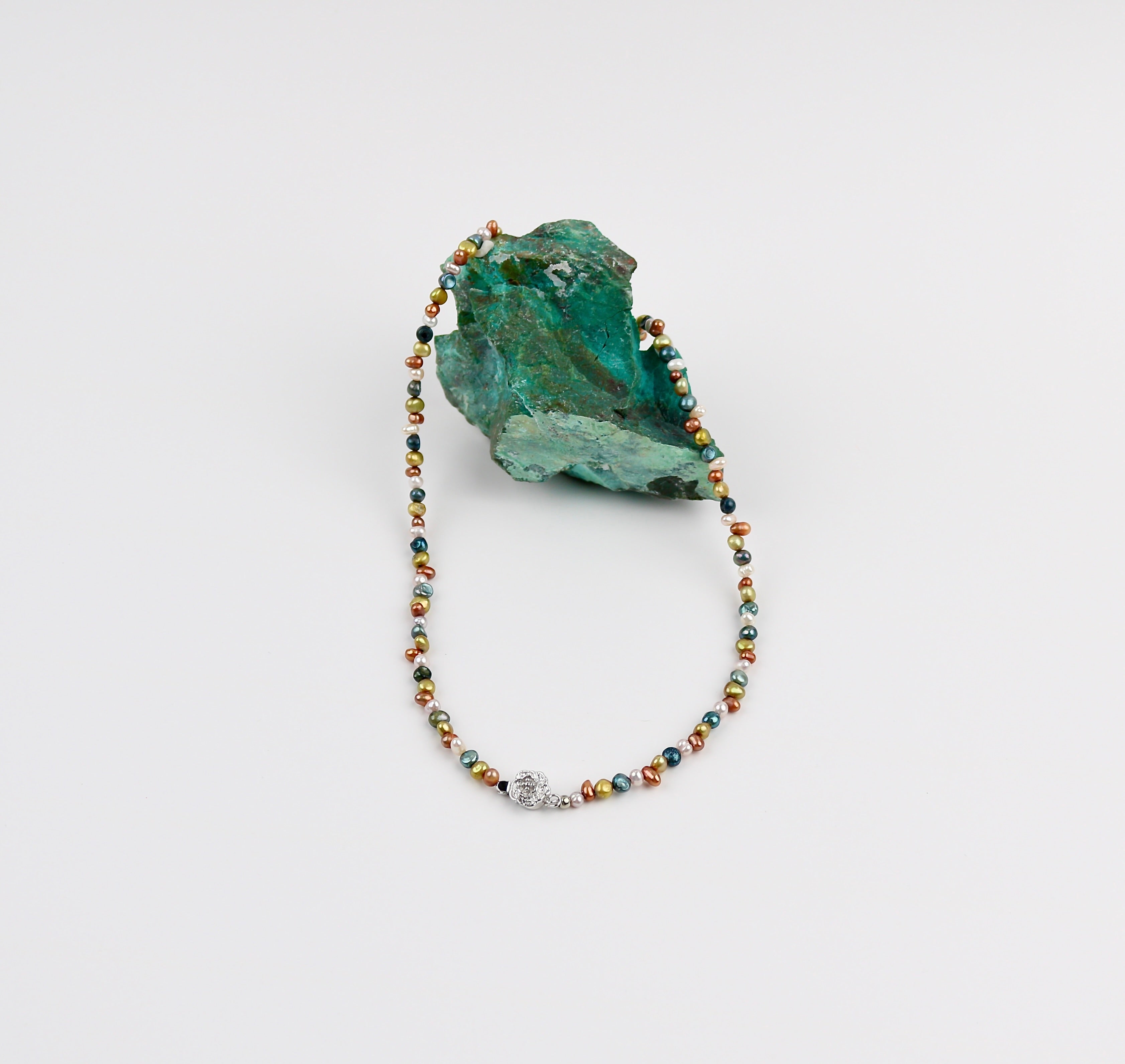 A joyful strand of tiny freshwater pearls dances with color like scattered gemstones caught in sunlight. Each pearl, kissed by nature in hues of teal, gold, blush, ivory, and bronze, creates a lively rhythm that feels both playful and refined. Hand knotted with care, the necklace drapes softly along the neckline, celebrating individuality and organic beauty. Finished with a delicate silver-plated clasp, it is a piece that brings effortless charm—perfect for layering or wearing alone as a subtle statement of color and light.