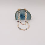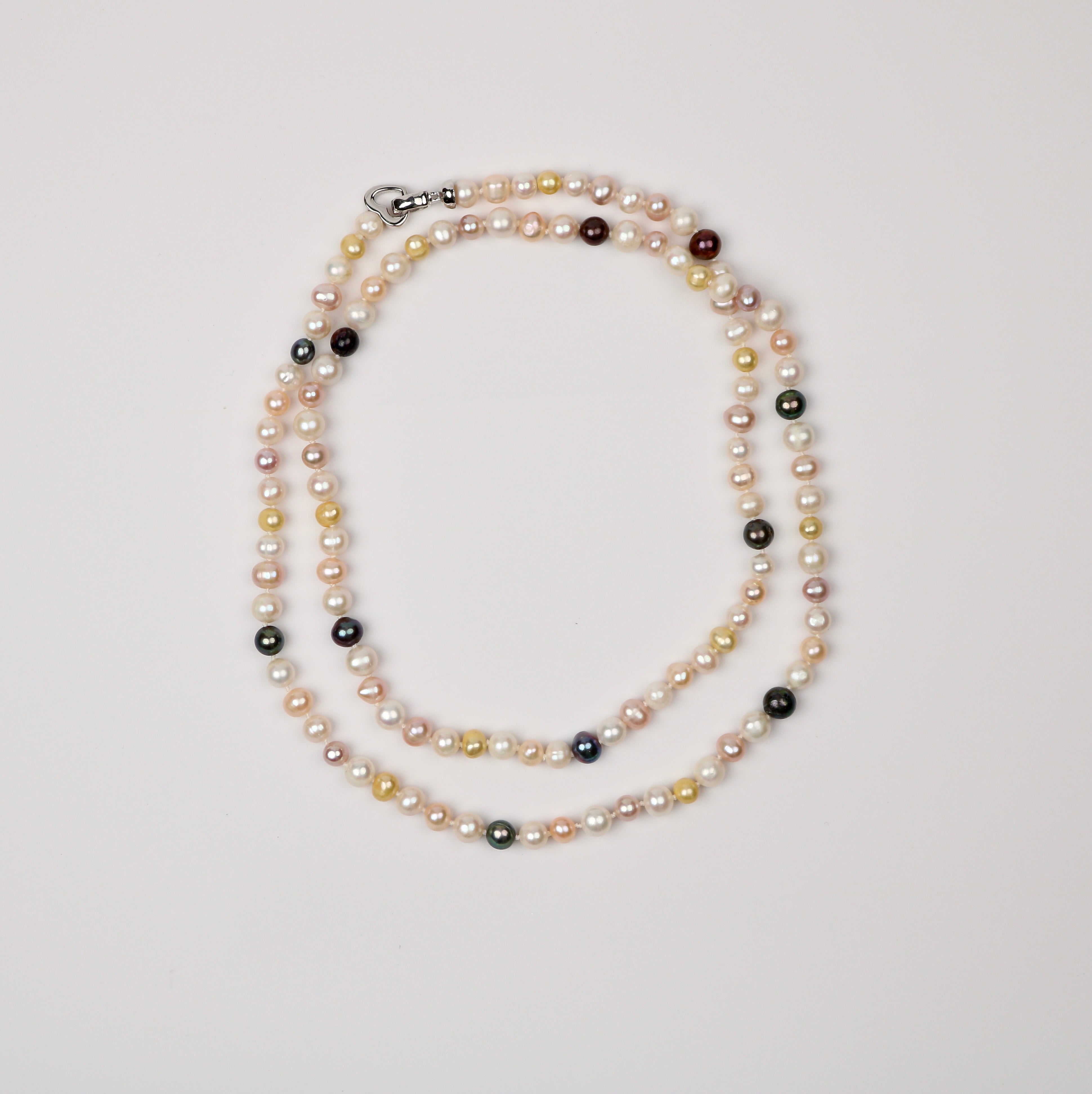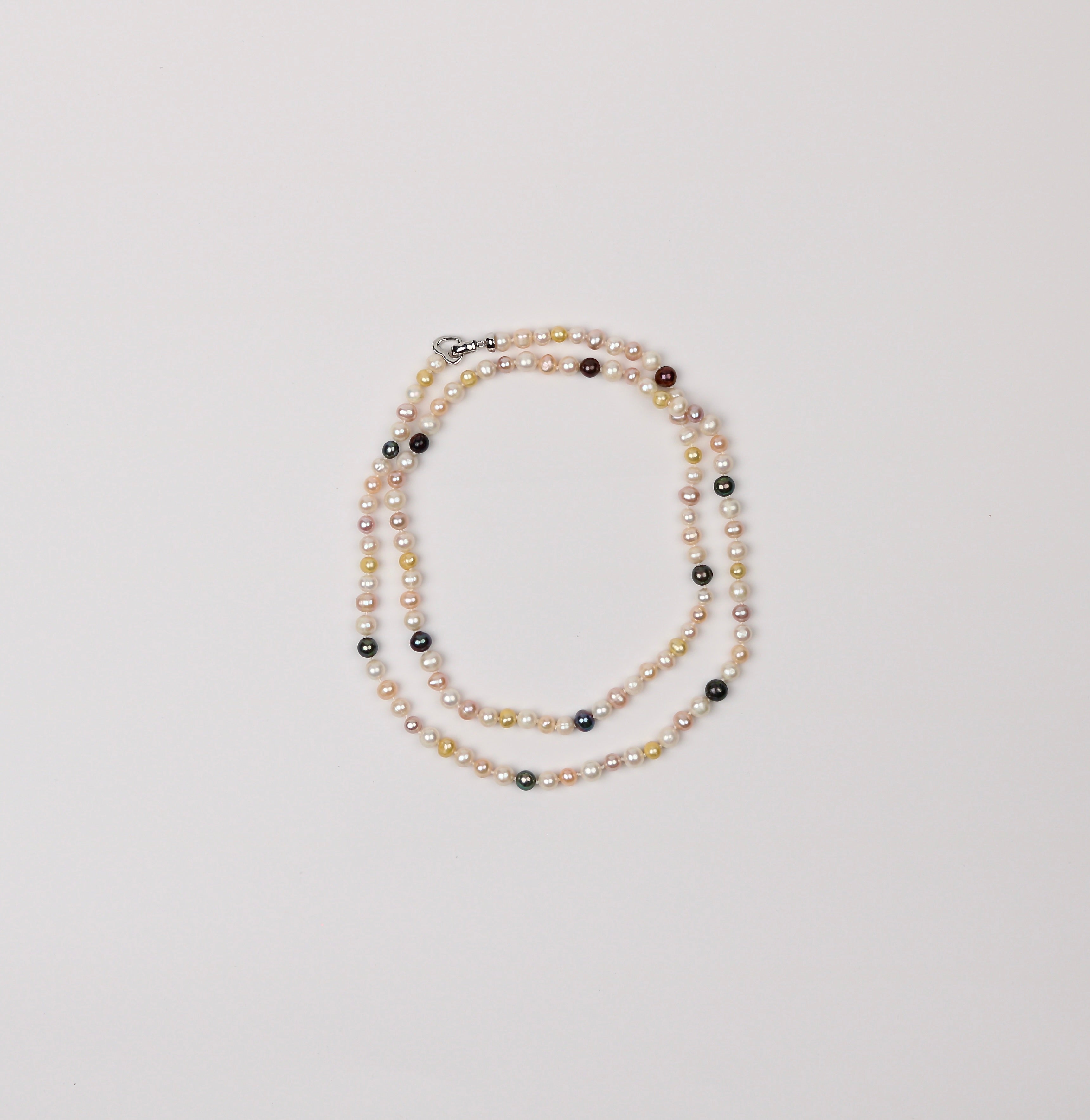 A gentle harmony of color and light, this necklace feels like a quiet conversation between pearls gathered from different moments in nature. Soft blush, creamy ivory, warm gold, and deep charcoal tones flow together in an effortless rhythm, each pearl adding its own whisper of character. Hand-knotted for fluid movement and lasting grace, the strand drapes beautifully along the neckline, offering understated elegance that transitions seamlessly from everyday wear to special occasions. Finished with a sterling silver clasp, this piece is both timeless and expressive—an ode to natural variation and refined craftsmanship.
