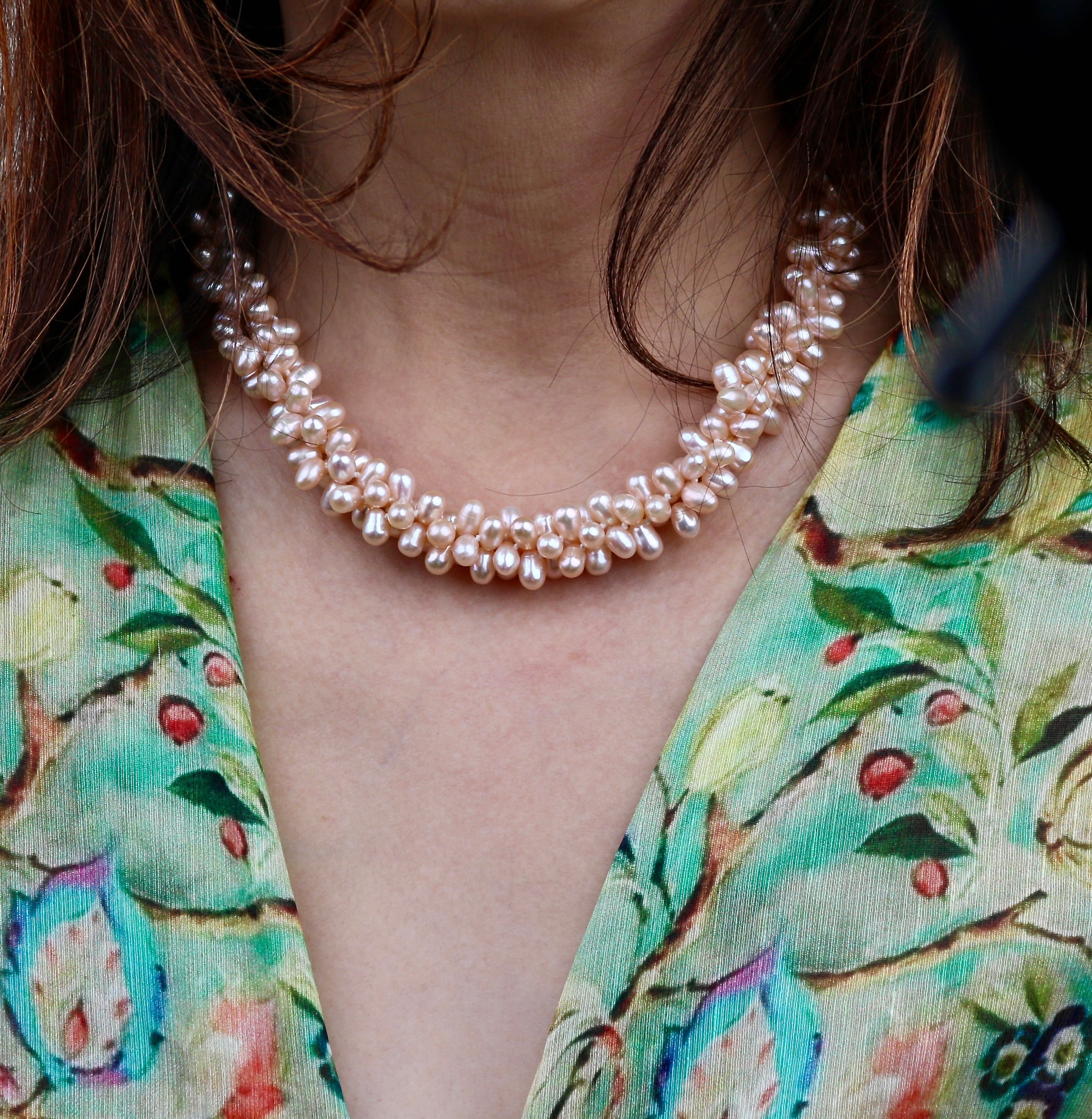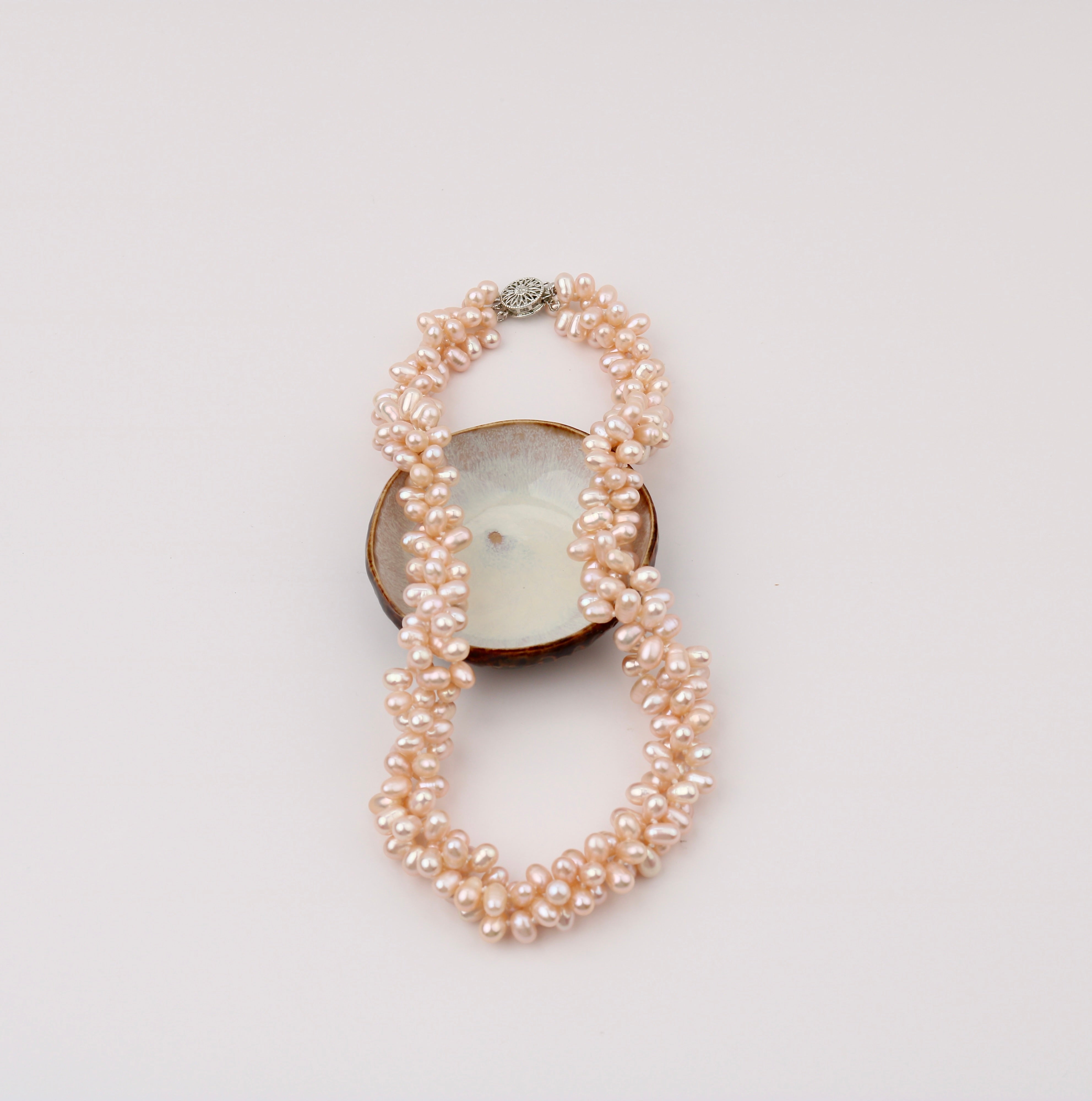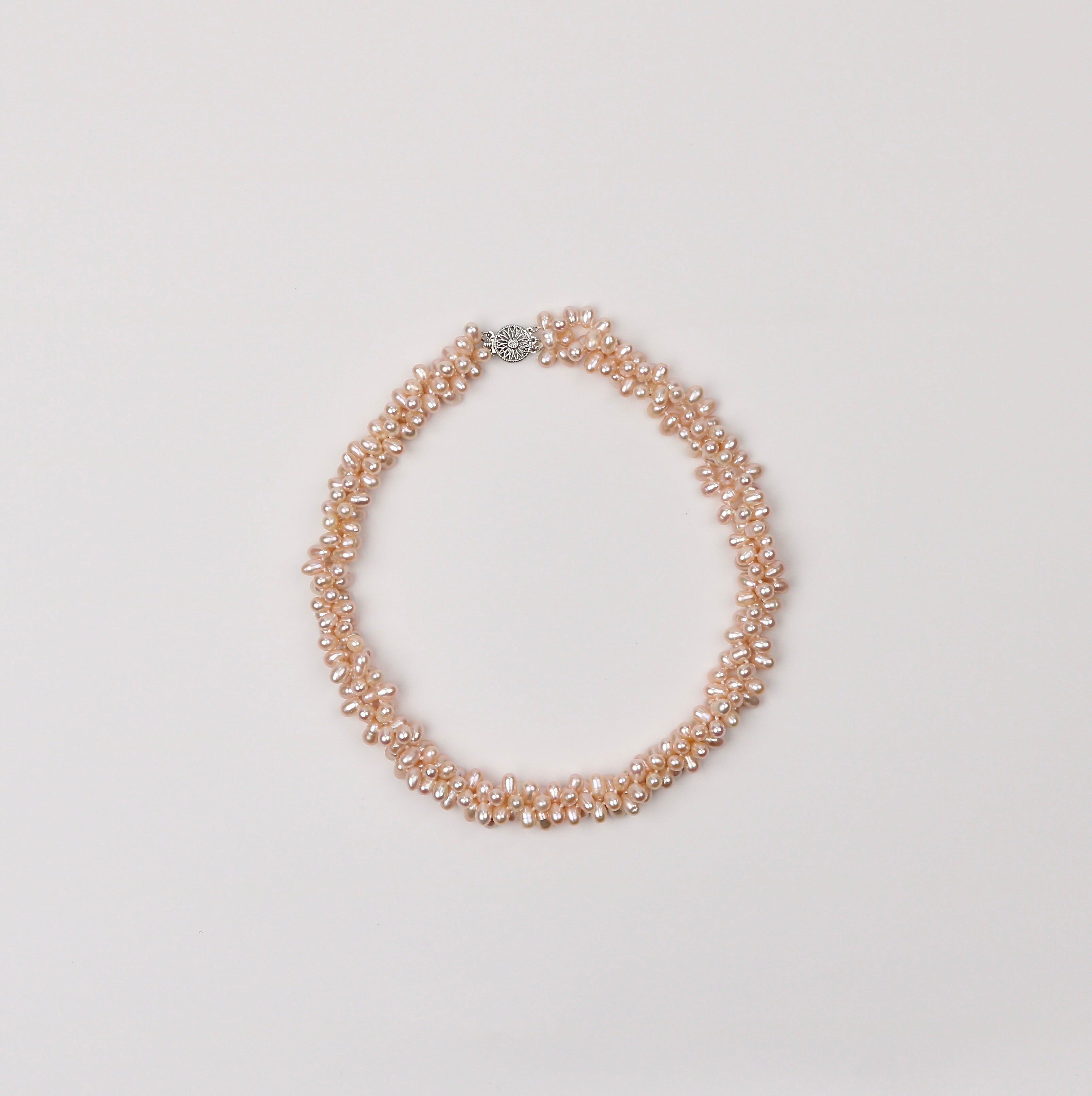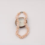 Softly luminous and full of movement, this necklace is a gentle celebration of texture and color. Three strands of blush-toned freshwater pearls are intricately twisted together, creating a sculptural silhouette that feels both romantic and modern. Each pearl carries its own natural character, catching the light with a warm, rosy glow. The flexible twist allows the necklace to drape uniquely on every wearer—effortlessly elegant, with a handcrafted soul.